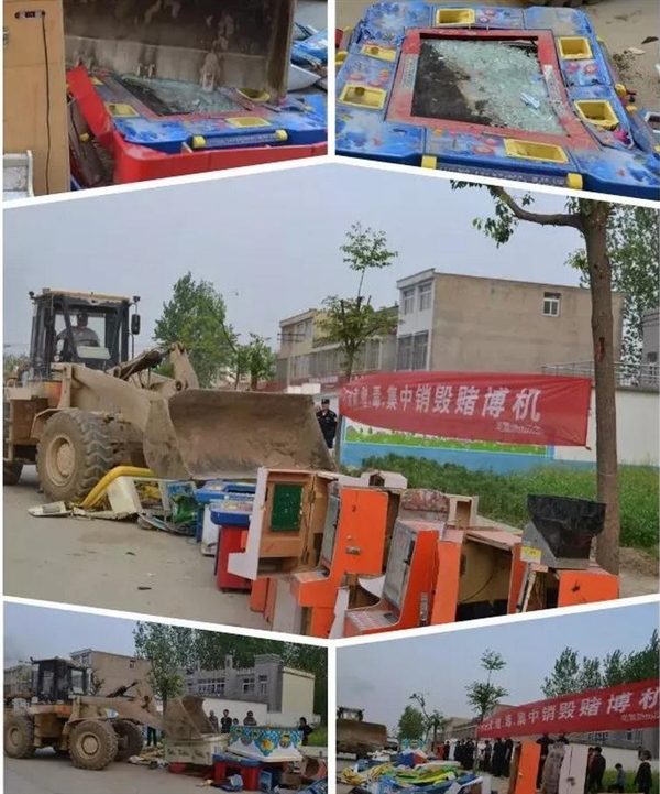 4月11日,一辆挖掘机从远处缓缓驶来,随着现场指挥人员一声令下,只听“砰砰”几声后,一台台赌博机破碎不堪。围观群众拍手叫好!