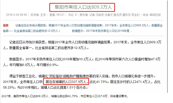 2017底,阜阳市常住人口达809.3万人,城镇化率达到41.75%,市区常住人口337.9万,符合建设要求。
