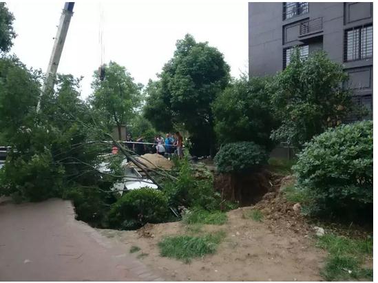 昨日16:30左右阜阳高速时代城华府小区5#楼附近一处地面发生下陷目测3米左右一辆双排座车与一棵树木陷入坑洞中…… 事发后,现场已经拉起了警戒线,吊机也在工作。 (部分